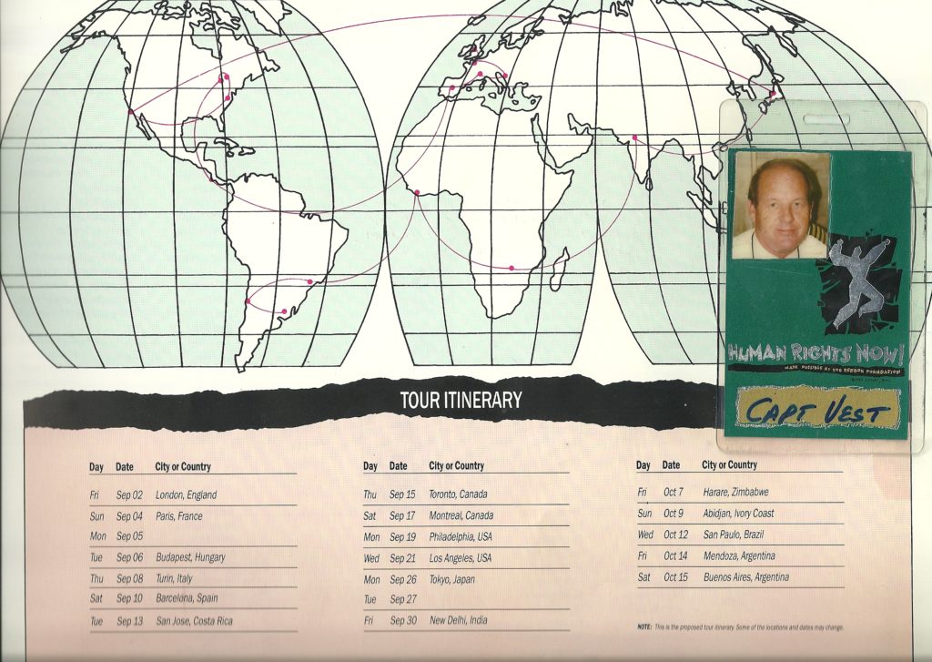 In 1988, World Airways was hired to transport the performers and equipment for the Amnesty International Human Rights Now tour. Warren was excited to have the opportunity to fly Bruce Springsteen and the E-Street Band, Sting, Peter Gabriel, Tracy Chapman, and Youssou N’Dour to performances in North America, South America, Europe, Asia, and Africa. Warren’s youngest son, Brian, turned 16 during this time. All five performers signed